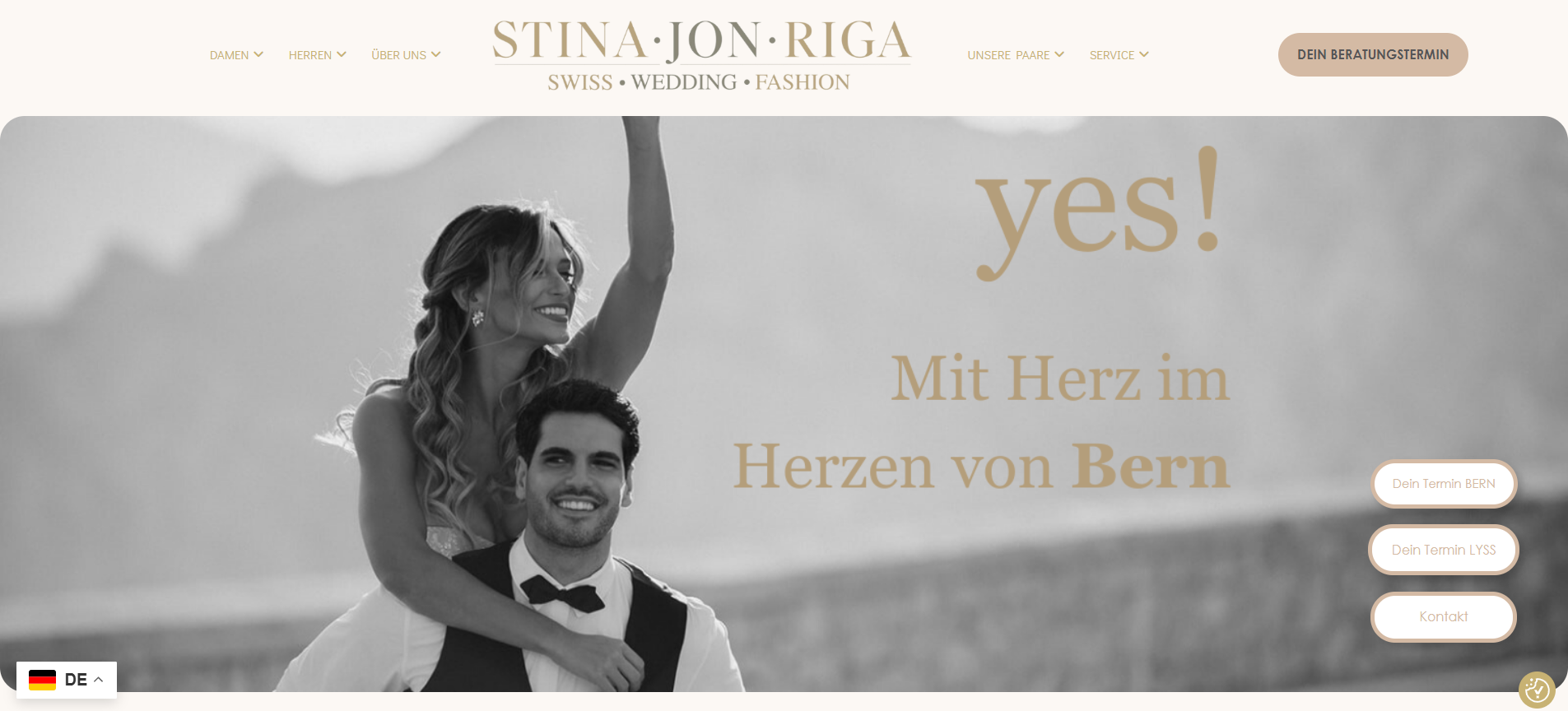 The website was created as the official online presence of Stina • Jon • Riga, a Swiss bridal and formal fashion boutique with locations in Bern and Lyss. The page showcases wedding dresses, bridal collections, men’s wedding and business suits, evening wear, and accessories. It is designed to present their fashion collections, explain their services such as fittings and tailoring, and allow customers to book appointments for personalized consultations.